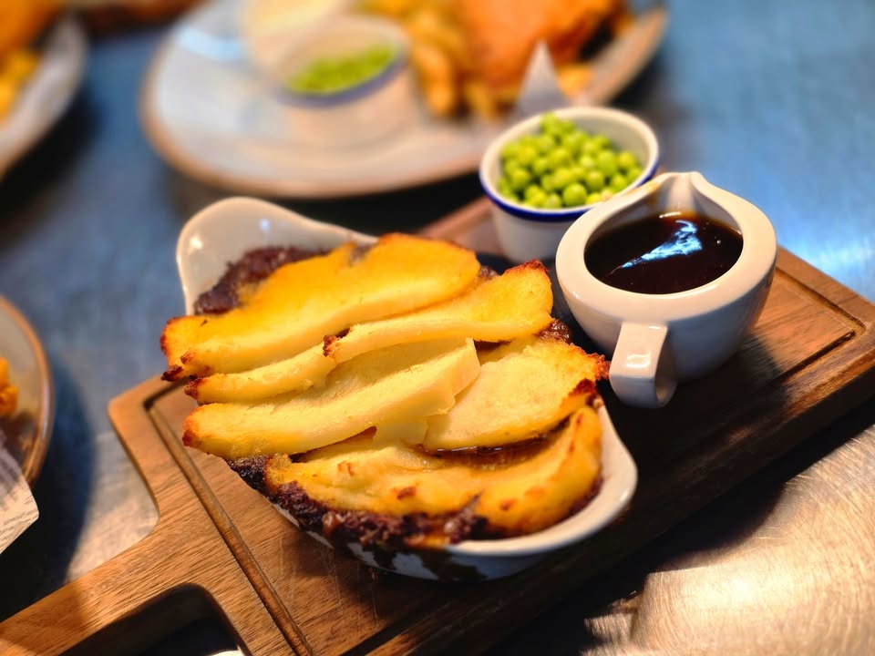 Our classic dish is on the menu and ready to warm you from the inside out. Slow-cooked beef, rich gravy, and a generous topping of golden, crispy potato slices—served with a side of peas and extra gravy for good measure.