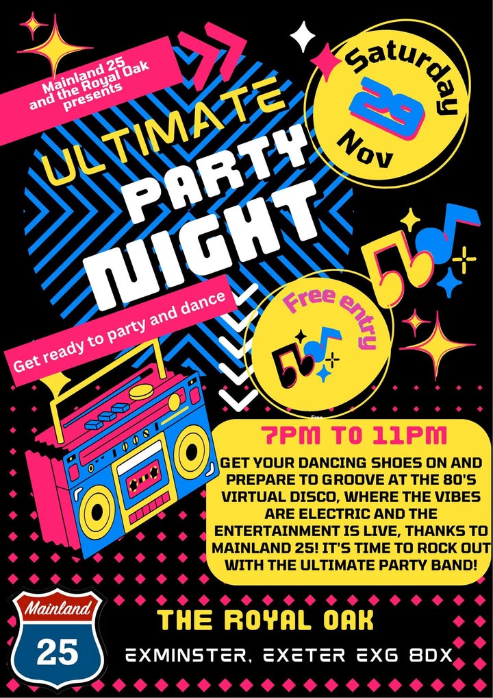 ✨️Saturday 29th Of November is our 80's party with Mainland 25 ! ✨️